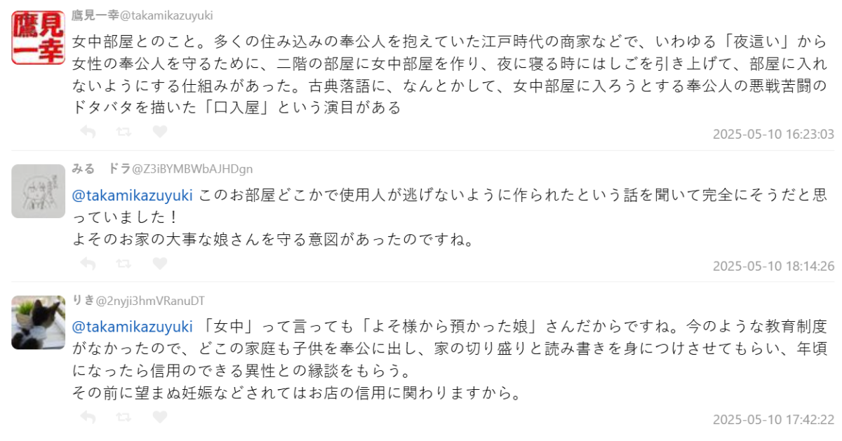 有網友指出這應該是是「女中部屋」——日本江戶時代到昭和初期,富裕家庭或商家裡專門給女僕(女中)居住的房間。這些女中大多是從鄉下寄宿到城市家庭工作的年輕女孩,通常會住在雇主家裡。