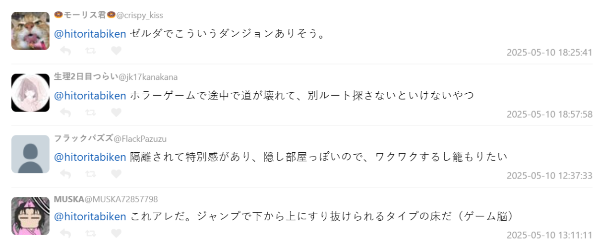 也有網友腦袋大開,留言像什麼「薩爾達神殿入口」、「恐怖遊戲裡的壞掉小路」、「跳跳樂機關」、「下方可穿越的 2D 平台」,甚至「忍者訓練房」……想像力真的很狂。