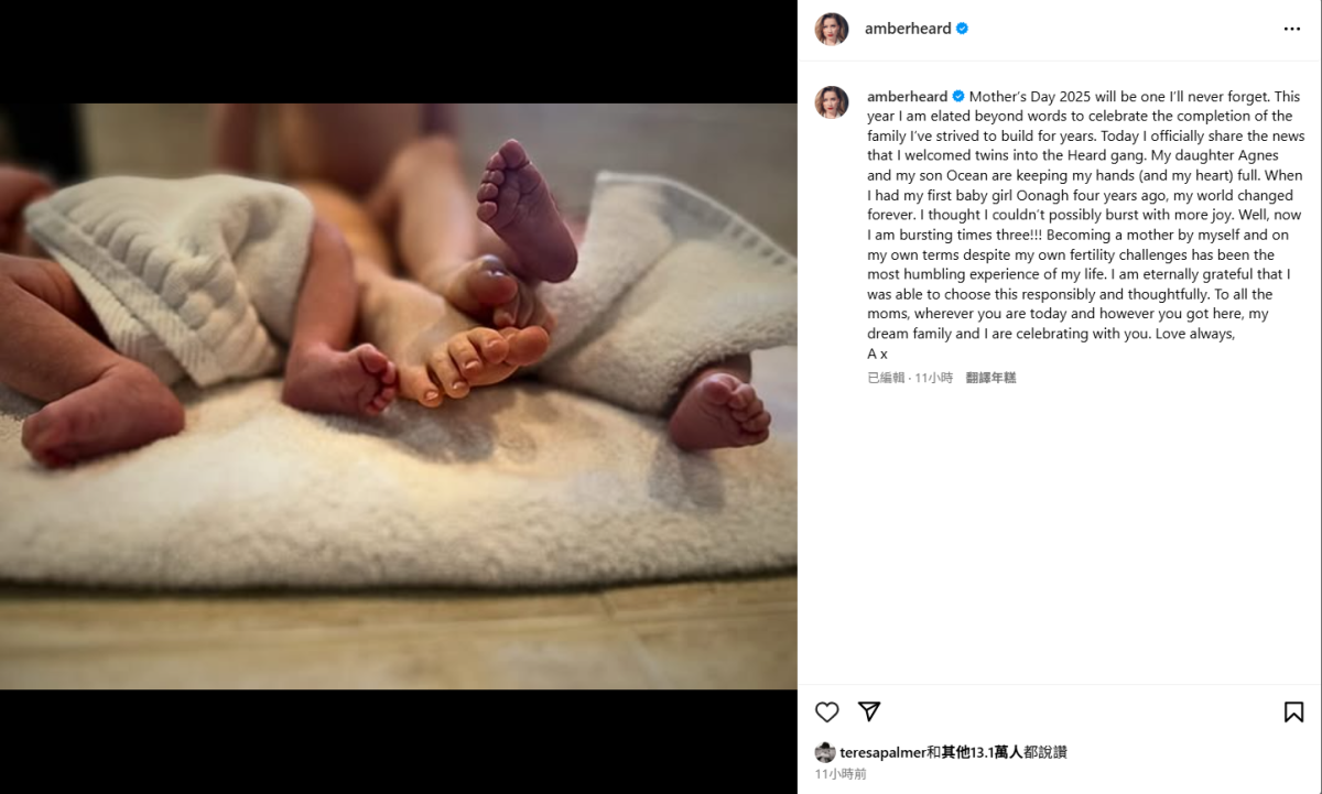 自從結束與前夫強尼戴普(Johnny Depp)的家暴誹謗官司之後,聲譽全毀的安柏赫德(Amber Heard)就淡出演藝圈,移居西班牙專心撫養她透過代孕所生的女兒烏納佩姬赫德(Oonagh Paige Heard)。而昨日適逢母親節,已經鮮少使用社群帳號的赫德,又難得上 Instagram 發文公佈一項(或者說兩項)大消息,那就是她的人生又迎來了兩娃。只不過這次,她並沒有透露是自己透過個人自然懷孕、或是另找代理孕母產下的。