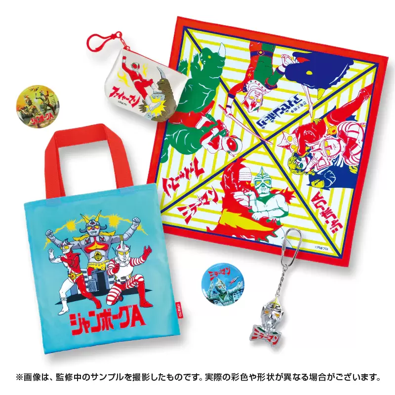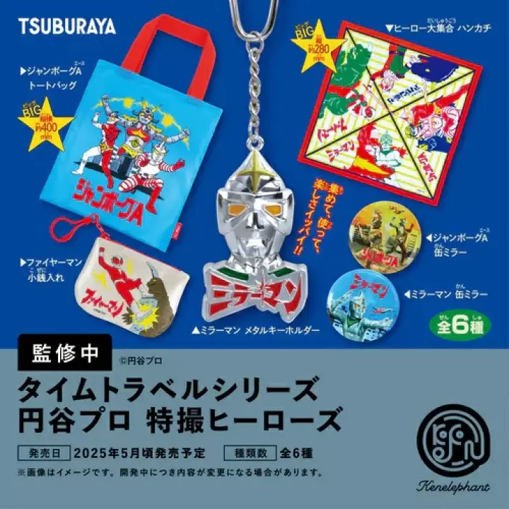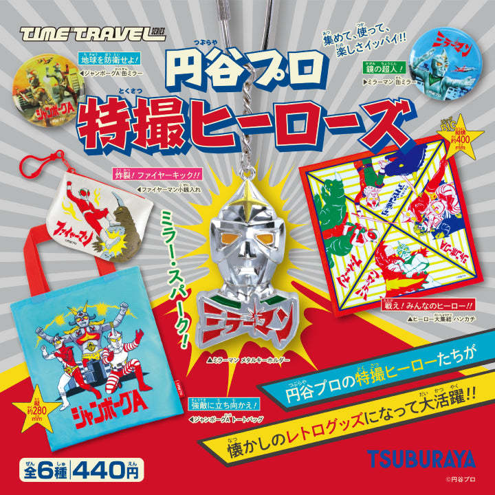 繼先前的「特攝英雄迷你軟膠吊飾」後,本次的特攝英雄時光旅行系列再度以圓谷製作 1970 年代推出過的多部特攝英雄作品為主題推出各式小物,分別為鏡子超人(ミラーマン)金屬鑰匙圈、鏡子超人小圓鏡、巨人力霸王詹伯A(ジャンボーグ A)小圓鏡、詹伯A手提袋、火炎人(ファイヤーマン)零錢包以及英雄大集合的手帕,每款都以簡約且昭和感滿點的色彩呈現,不論是吊飾還是實用小物都散發滿滿的懷舊氛圍!