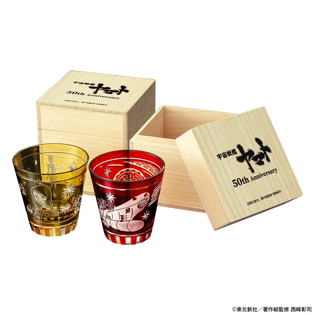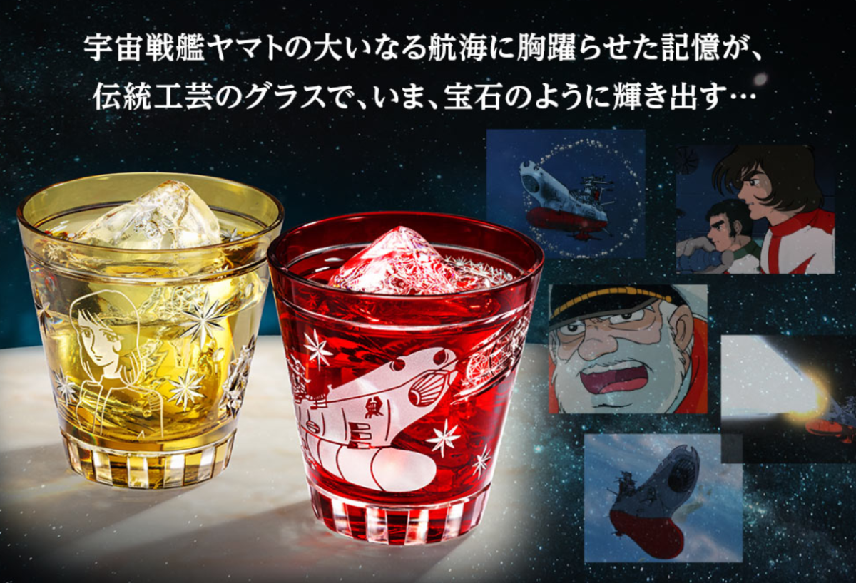 這次推出的玻璃杯由「江戶切子協同組合」認證的職人手工在雙層玻璃表面進行純手工雕刻打造,採用傳統色被玻璃工藝,再透過切子與噴砂技法製作,細節滿滿、質感爆棚。共有兩款設計,分別為:以「大和號(紅色)」與「森雪(琥珀色)」為主題,向這部經典致敬。