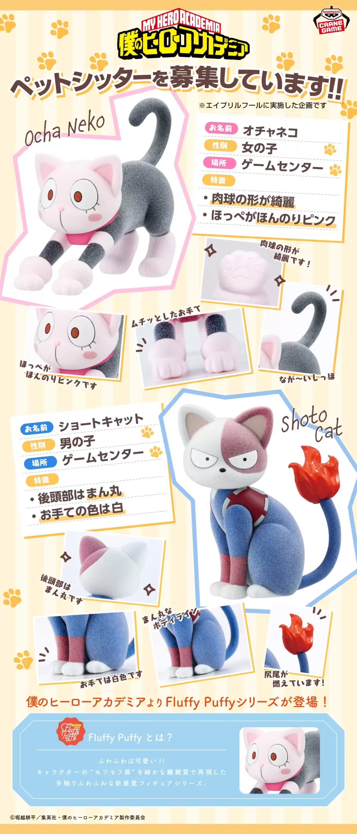 日本 BANDAI SPIRITS 公司景品品牌 BANPRESTO,旗下兼具柔軟觸感與可愛造型的「Fluffy Puffy」系列,將推出以人氣動畫《我的英雄學院》為主題的最新商品「Fluffy Puffy~轟焦凍貓&御茶子貓~」!預計於 2025 年 05 月發售。