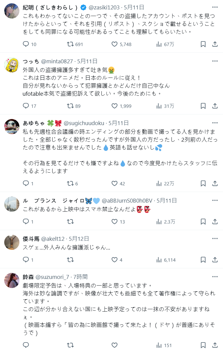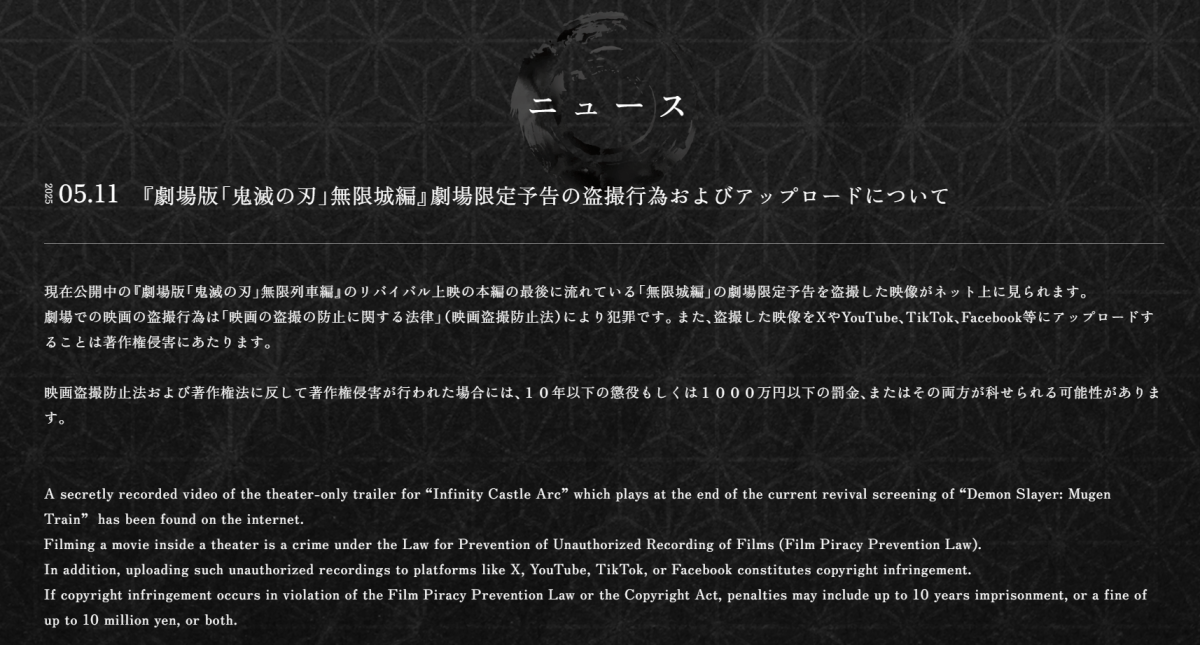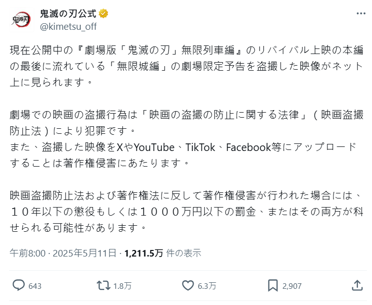 官方在官網與 X 上發文表示,於戲院內拍攝影片已違反《映画盗撮防止法》,而擅自上傳影片則觸犯《著作權法》中關於「公眾傳輸權」與「可傳輸化權」的規定,最高可處 10 年以下有期徒刑或 1000 萬日圓以下罰金,甚至兩者並罰。