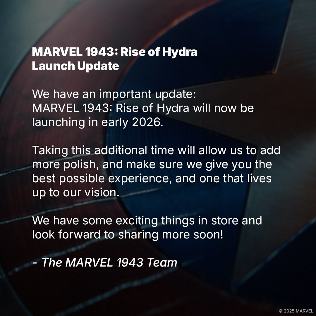 由 Skydance Games 開發的漫威新作《漫威1943:九頭蛇崛起》(暫譯:Marvel 1943: Rise of Hydra),原定於 2025 年推出,如今確定將延期至 2026 年初發行。官方透過其社群平台 X(原 Twitter)宣布此消息,表示延後發售將有助於進一步打磨遊戲品質,確保帶來最理想的遊玩體驗。
