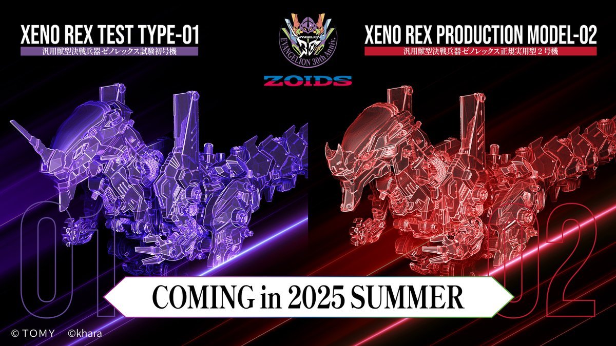 日本玩具公司 TAKARA TOMY 旗下玩具品牌 T-SPARK 推出的「SYNERGENEX」系列,在『第63屆日本靜岡模型展』搶先展出《ZOIDS》與《新世紀福音戰士》合作的最新商品:「汎用獸型決戰兵器 傑諾暴龍 試驗初號機、正規實用型2號機」的試作品!預計於 2025 年 07 月預購發售。