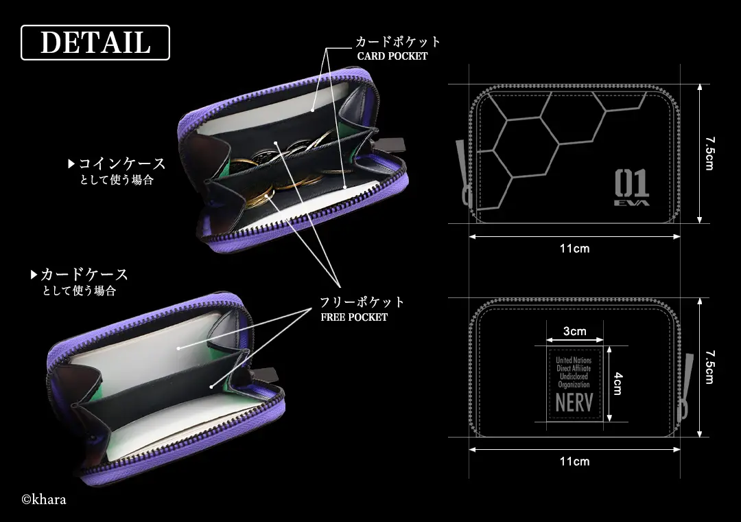 本次合作推出包含 : 初號機、二號機、零號機、八號機以及 Mark. 06 為主題的零錢包款式,為了營造 EVA 的氛圍,整體選用帶光澤、質地偏硬的真皮牛皮展現高質感,並搭配各機體的代表色。