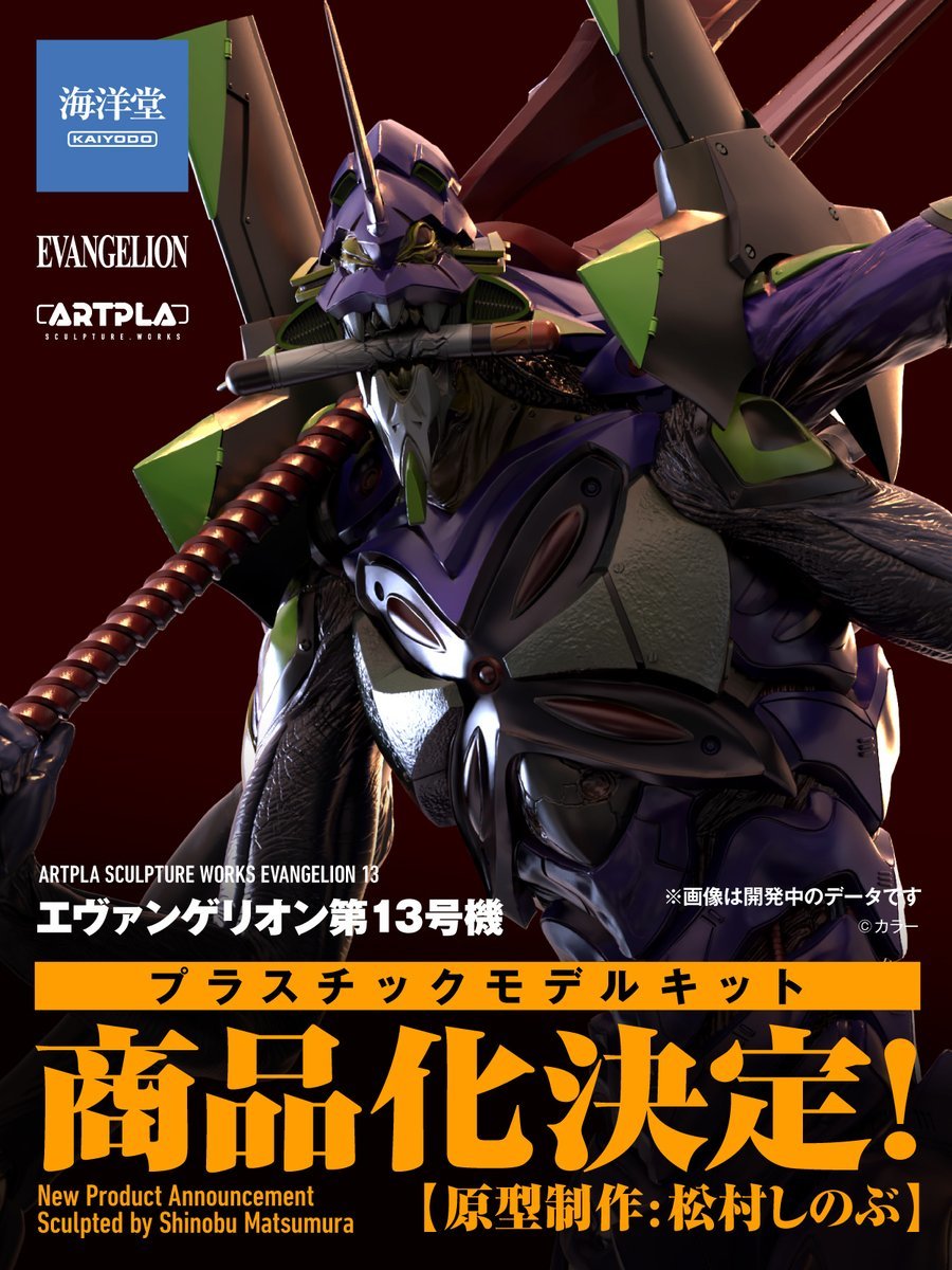 「ARTPLA 第13號機」塑膠組裝模型,比起 GK 製作相較起來較為簡單、價格也相對便宜。由原型師松村忍以新規造形,再現第13號機胸口交叉狀的甲冑解開成為第二對手、拔出雙槍的四手造型;注入松村忍風格的生物感細節,腳踩著獸化二號機的殘骸、將駕駛艙咬碎的狂暴之姿,相當震撼!詳細商品情報將於後續公開。