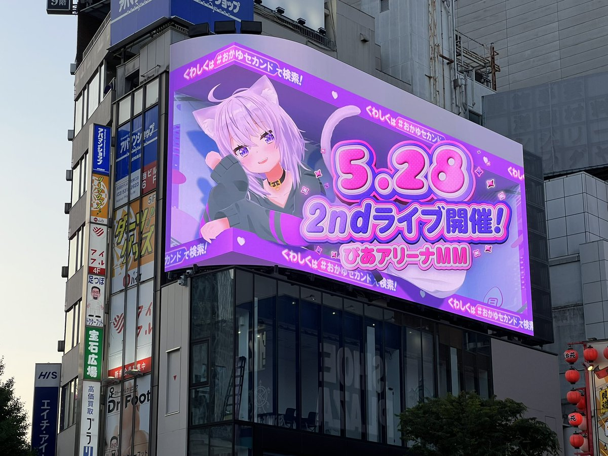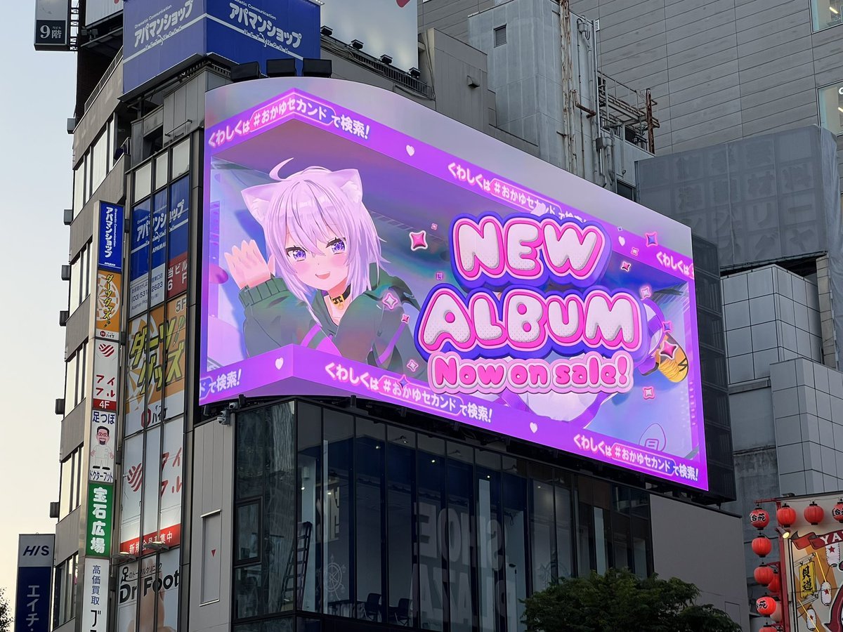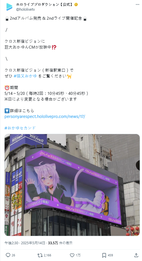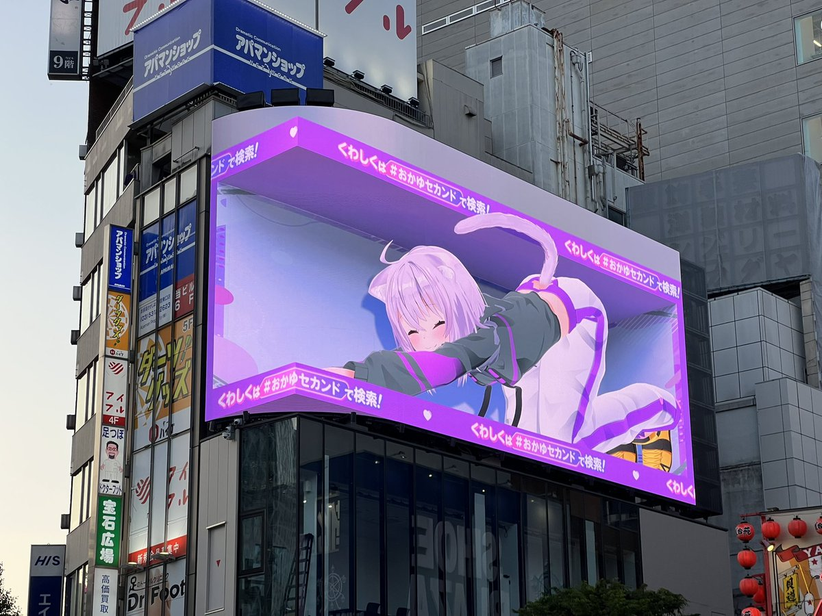 今日 ( 5/14 ) 著名的 Hollive VTuber 經紀公司 COVER 宣布,設立隸屬 hololive Gamers 的成員「貓又小粥」(貓又 おかゆ)的廣告看板,宣傳個人第二章專輯發行 & 第二場 LIVE 開催記念,3D 會動的小粥將在此跟大家見面。