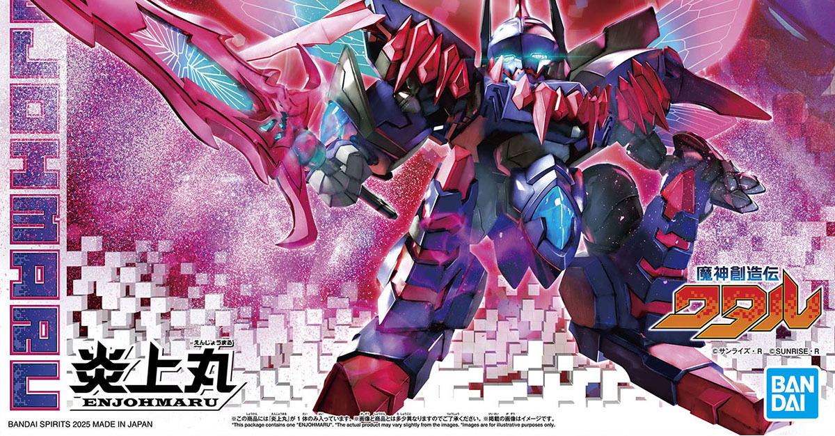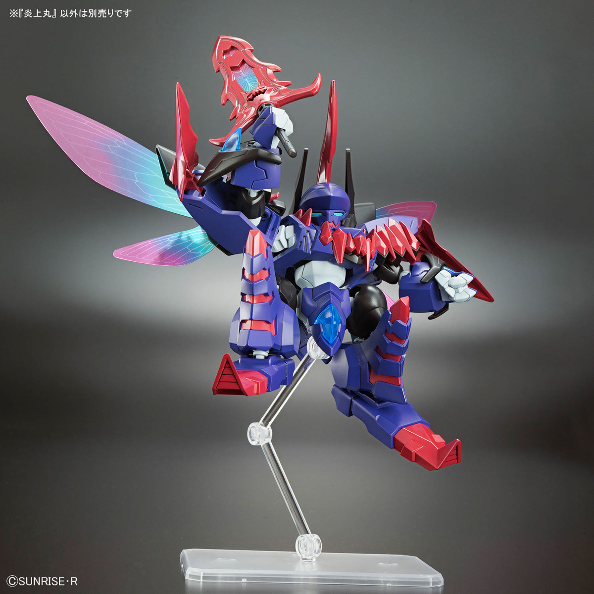 此次推出的「炎上丸」是劇中大 BOSS「炎上達」所使用的魔神,組裝模型套件運用紅色、靛色、透明藍等多樣的成型色零件,還原其表現災禍、邪惡的機身造型與色彩,背部展開的「炎上顯示翼」、專用武器「炎上暗劍」更使用漸層色彩的 PET 膠片表現昆蟲翅膀般的偏光效果。
