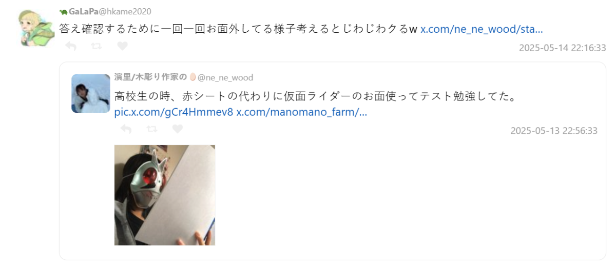 近日日本 X 上有網友提問「說說你人生最瘋的時期做過的怪行為」( 人生で一番狂っていた時にやっていた奇行 ),吸引不少人分享人生怪事。有名 22 歲的木雕藝術家推主濱里表示,自己曾用假面騎士的面具代替紅色遮色片來背書。這則爆笑回憶瞬間引爆熱議,網友狂笑:「這是我看過最天才的奇行之一!」