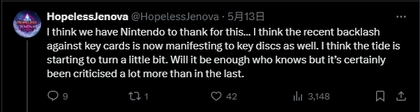 ▼「我認為這要『多虧』任天堂……近期針對遊戲鑰匙卡(Game-key cards)的反彈聲浪,如今也延燒到了「鑰匙光碟」(key discs)。我覺得這股潮流開始有些轉變了。是否足以帶來改變還不確定,但這種做法確實比過去受到更多批評。」