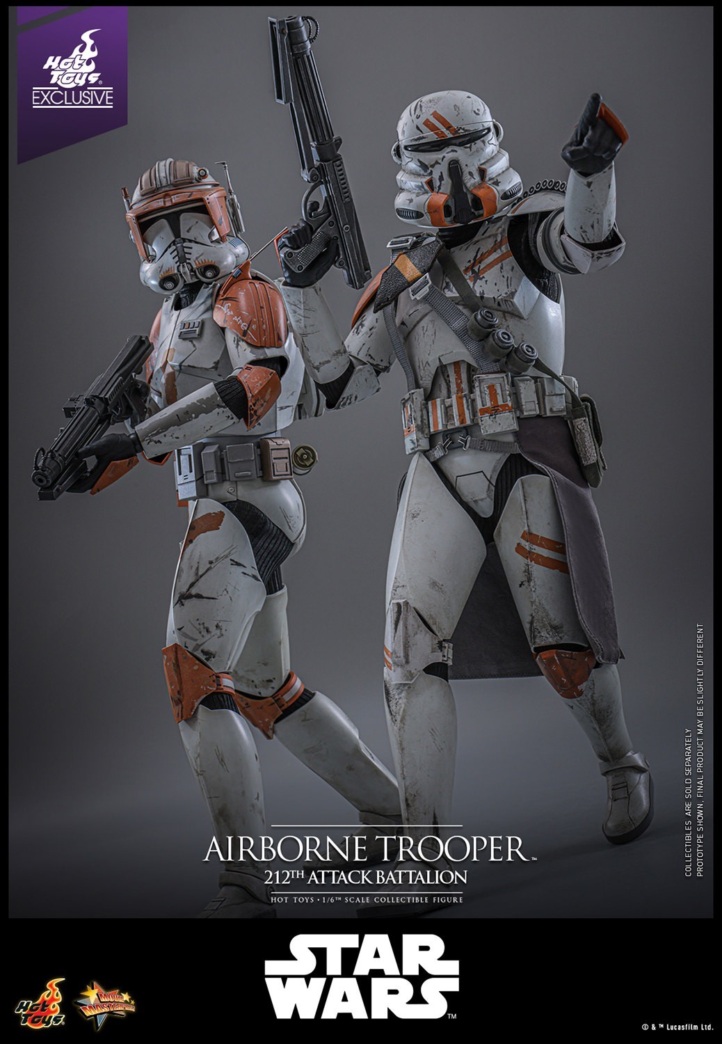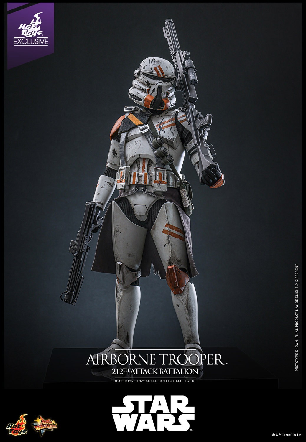 本次的複製人空降部隊士兵(第212攻擊營)1/6比例收藏級人偶與指揮官寇迪一樣採用的是《西斯大帝的復仇》中駐紮在尤塔帕(Utapau)星上時的造型,雕刻精緻的還原了空降部隊士兵的盔甲,腰間的灰色襯布與內裡的黑色內搭採用布料剪裁重現,裝甲以精湛的舊化技術呈現出盔甲表面被刮花的、象徵212攻擊營的黃色花紋的戰損效果與髒污!配件部分附有多組替換手、一把爆能步槍、一把長爆能步槍、戰術背袋以及一個特製的沙地主題展示底座,可以搭配同步推出的指揮官寇迪與歐比王擺設重現電影中的場面!