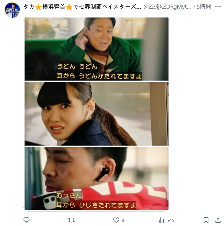 也讓網友想起 2024 年日劇《極度不妥!》中,由阿部貞夫飾演的體育老師小川市郎,某天坐上可以穿越時空的公車,從 1986 年穿越到 2024 年,看到人們耳朵戴著藍牙耳機,就疑惑「怎麼耳朵裡掛著一條烏龍麵」,還被年輕人嘲笑「大叔從耳朵跑出路尾菜了。」,看來這次日清把這部日劇的梗也拿來用啊 XD。