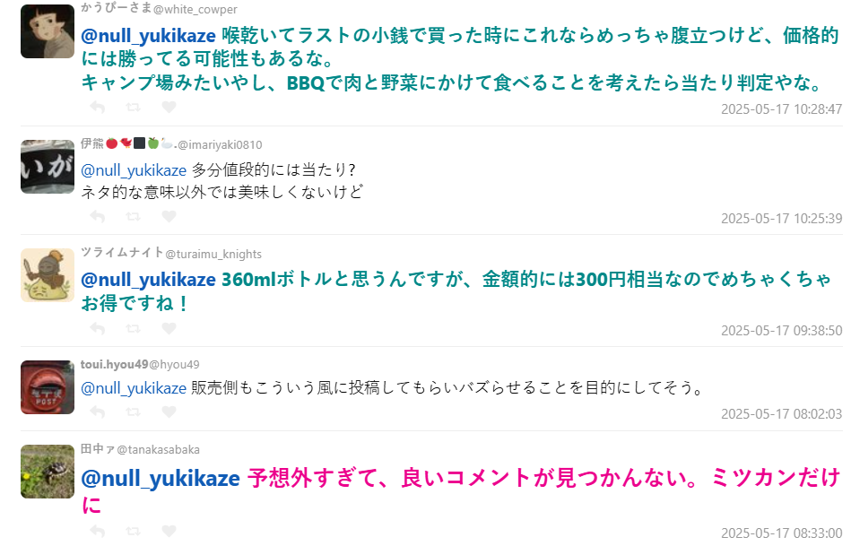 也有網友從務實角度指出,其實味ぽん市價約 300 日圓,而販賣機內的「奇蹟」僅 200 日圓左右,「從價格來看是賺到」、「拿來烤肉當沾醬還不錯啊」、「露營用得到,算大獎啦」。