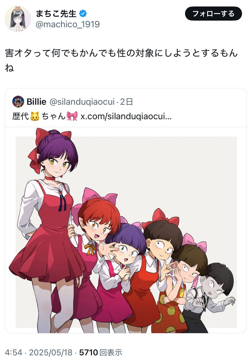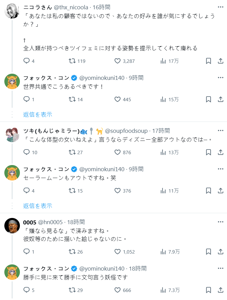 有部分網友轉推繪師的貼文,指稱這些惡意的動漫宅客群,把貓娘的形象從過往變成六期這種媚宅的姿色,以男性視角當作一種性幻想對象,稱其「不符合現實」、「物化女性」,覺得實在很糟糕。當然這些人的發言也被其他網友視為激進女性主義者,近來在日本 X 社群上也越來越多。