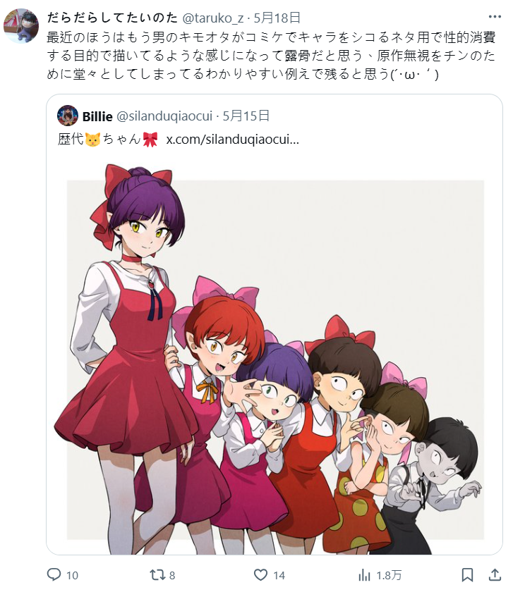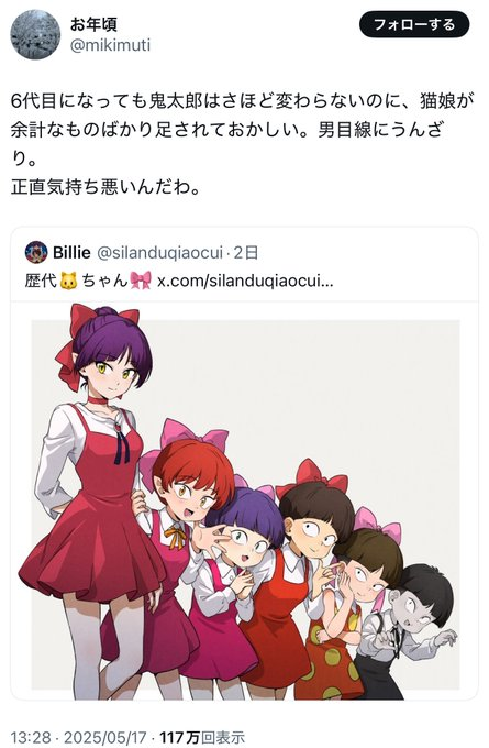 不過近日日本 X 上,有名中國繪師 Billie ( @silanduqiaocui ) 畫了《鬼太郎》動畫歷代貓娘的插圖,卻遭到激進網友抨擊,吸引不少日本網友關注,甚至連繪師本人都覺得莫名其妙,這樣話也被攻擊到底是怎麼回事。