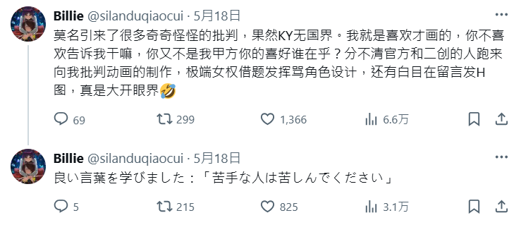 繪師 Billie 也認為這很莫名其妙,自己喜歡《鬼太郎》才畫圖,被一些奇怪的人跑來攻擊,直批這些人:「KY(不會讀空氣)這件事,真的是無國界的呢」,不能理解怎麼會有些日本女權帳號借題發揮。