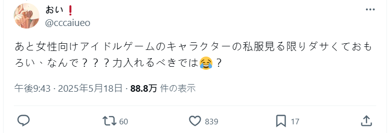 他還點出了尤其是女性向的偶像遊戲角色,私服設計常常又醜太好笑,到底為什麼會長這樣???這不應該是重點之一嗎?