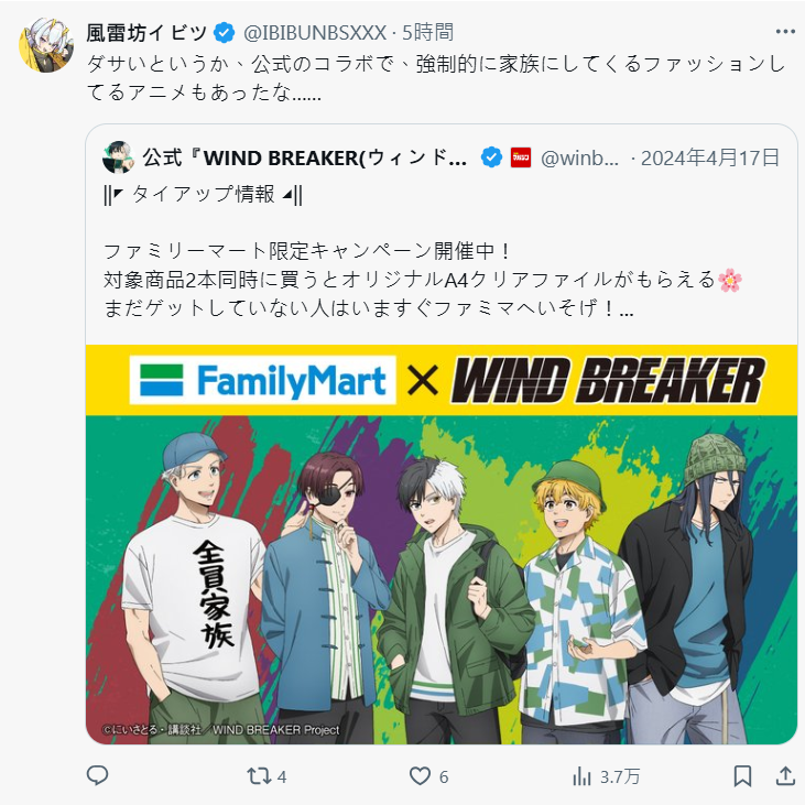 近年很紅的《WIND BREAKER—防風少年—》也是如此,跟全家聯名結果就穿成這樣,也讓粉絲感到心寒。