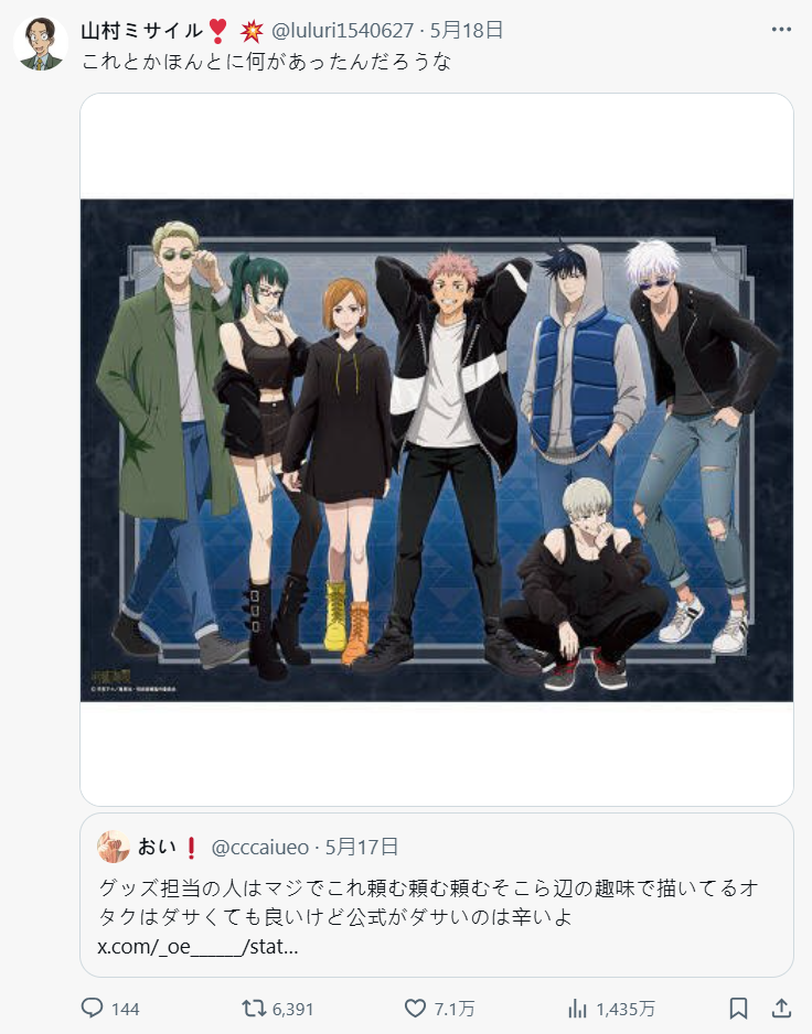 也有網友看到這個話題,直覺就想到《咒術迴戰》當年動畫開播沒多久推出的私服快閃店活動繪圖,也是被吐槽到爆炸,連五條悟跟七海建人如此帥氣的角色,都穿上莫名其妙的衣服,完全沒有原本的魅力。