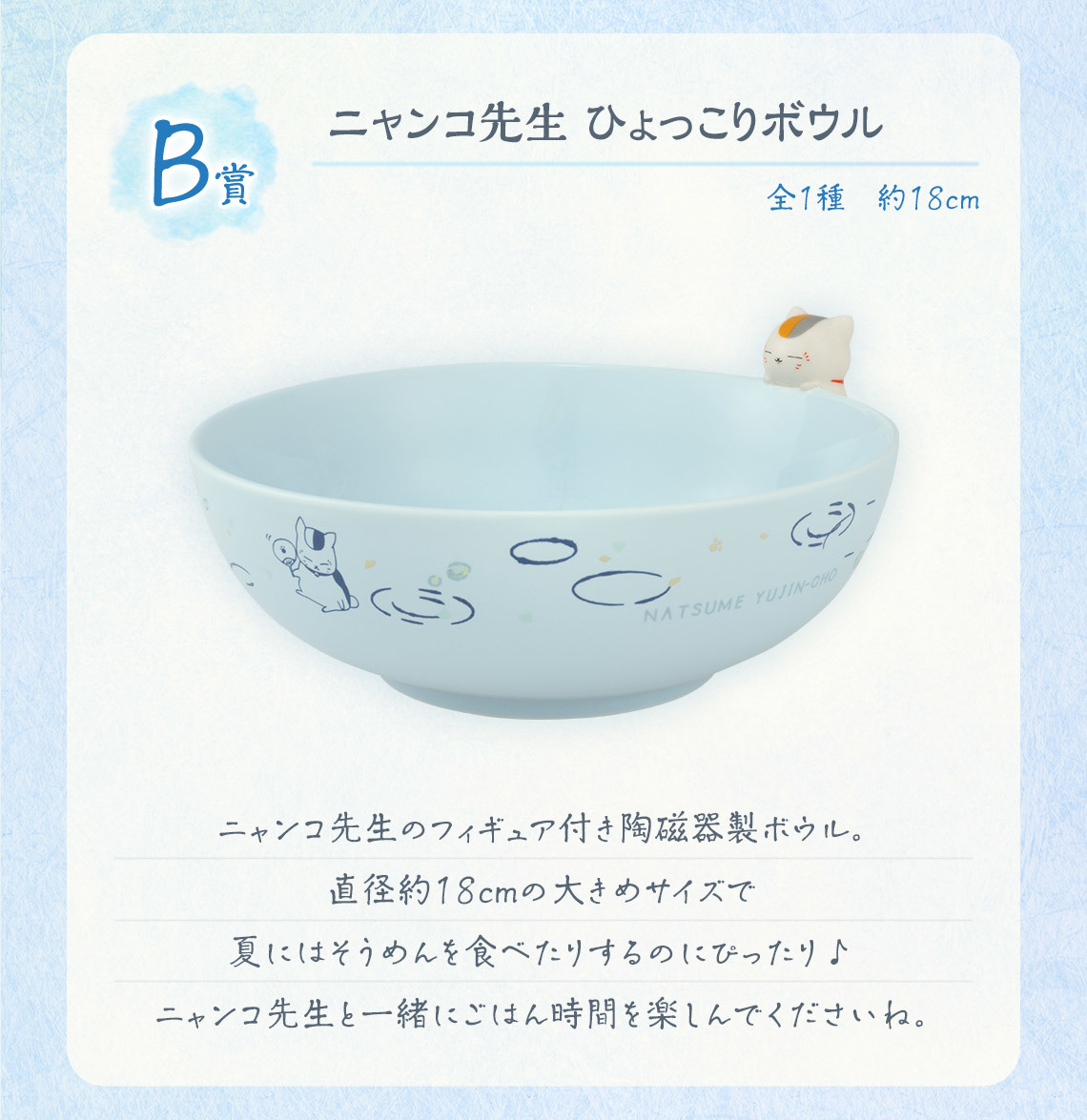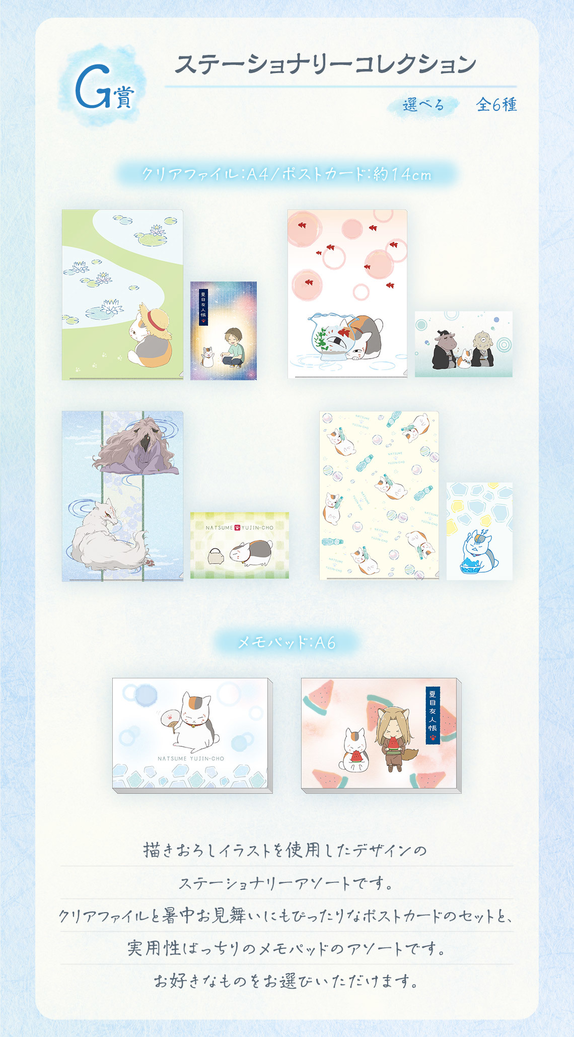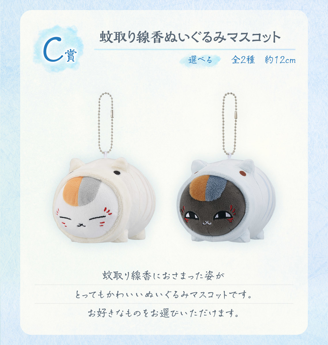 本次的「夏目友人帳 捎來夏日問候」將以各種充滿夏日氣息的主題提供A~G、最後一賞與雙重中獎賞等不同級別的賞品。其中A賞為貓咪老師造型夜燈,將貓咪老師仰躺的模樣立體化,在開啟開關後便會以暖黃色的燈光照亮四周,看他在榻榻米上睡覺的樣子感覺都涼爽起來了!