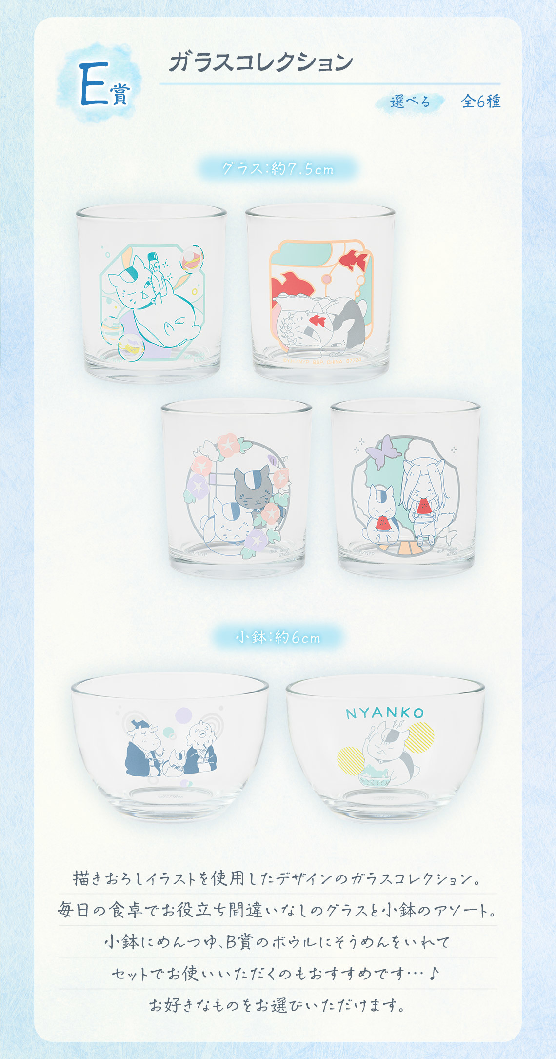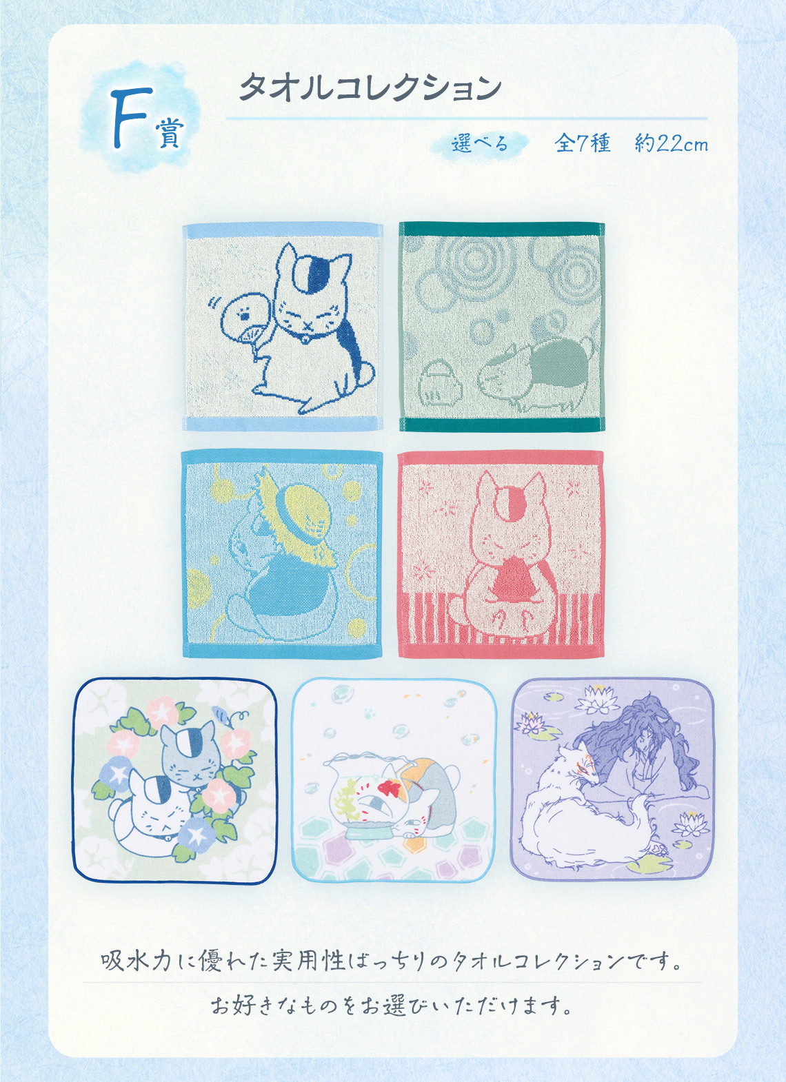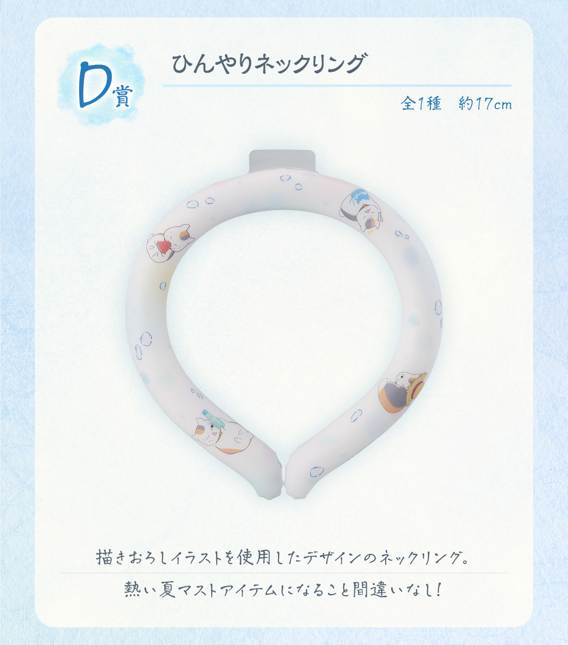 本次的「夏目友人帳 捎來夏日問候」將以各種充滿夏日氣息的主題提供A~G、最後一賞與雙重中獎賞等不同級別的賞品。其中A賞為貓咪老師造型夜燈,將貓咪老師仰躺的模樣立體化,在開啟開關後便會以暖黃色的燈光照亮四周,看他在榻榻米上睡覺的樣子感覺都涼爽起來了!