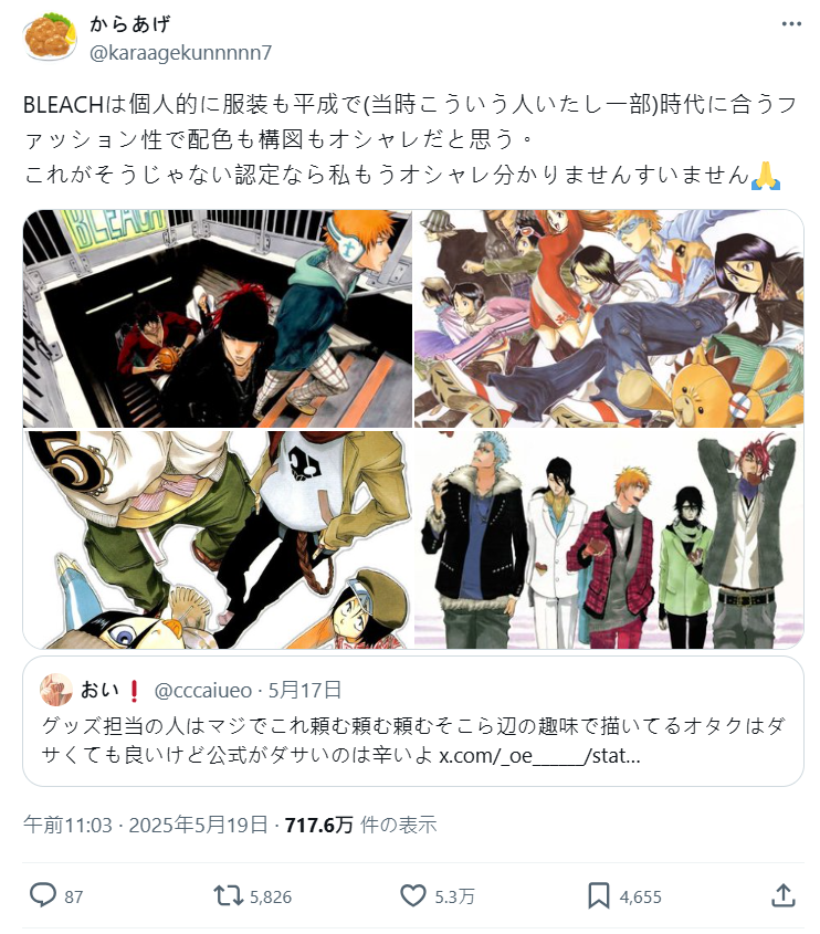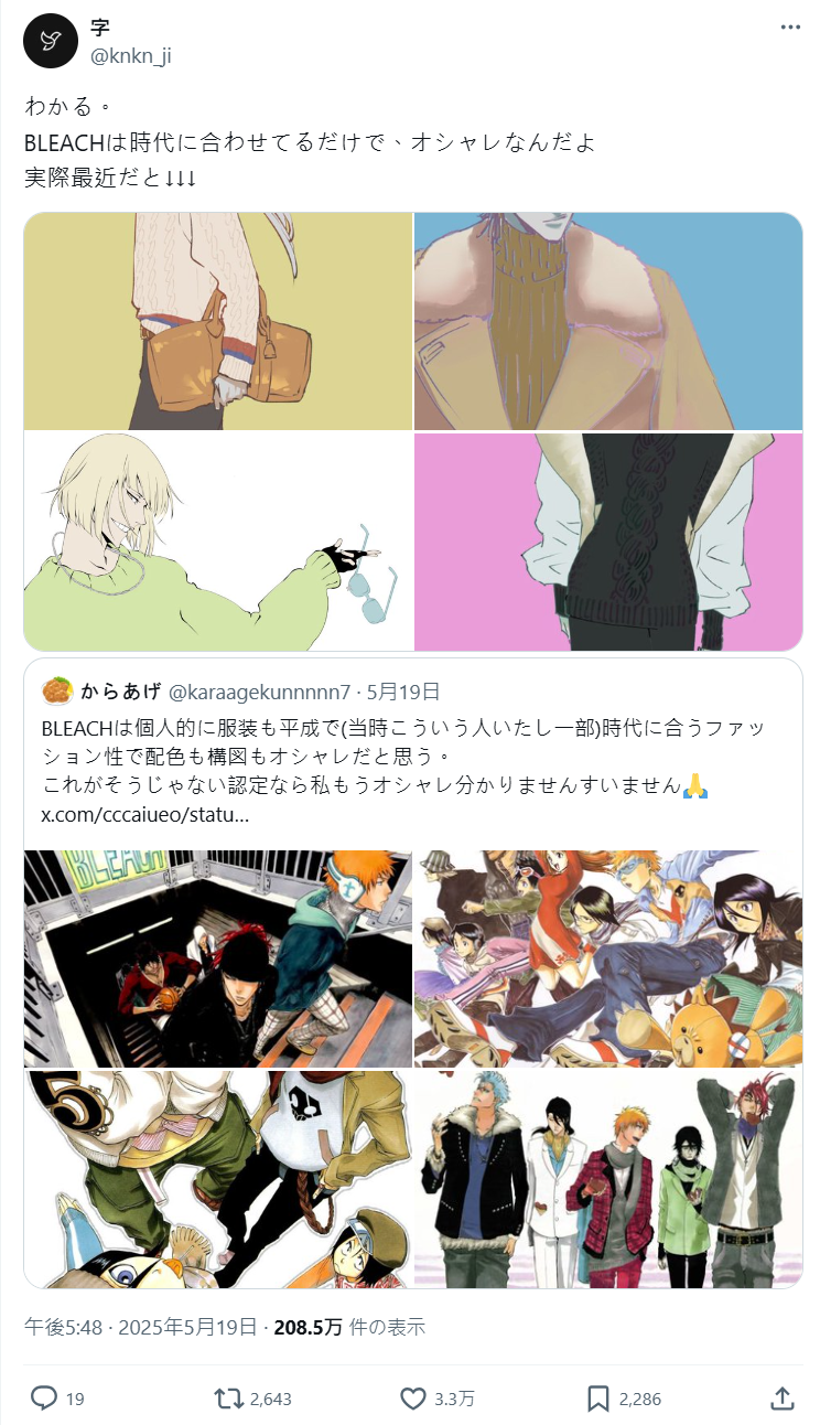 之所以有這樣的討論,是因為昨日報導的「官方」推出的角色周邊繪圖「太土」的話題,其中有網友點名《BLEACH 死神》的服裝就很有平成時期的風格(當時真的有一部分人是那樣穿的),整體穿搭配色跟構圖都覺得很有型。但看到網路上有人評為「俗氣」,是覺得有過頭了,這的確反映出連載當代的穿著流行。