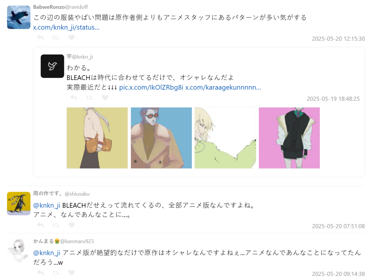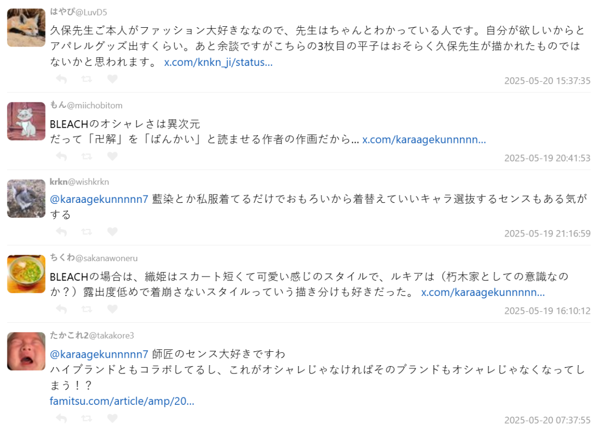 不少網友指出,原作作者久保帶人對時尚非常有研究,甚至親自監修角色穿搭。「久保老師本身就超愛時尚,他推出的服飾商品都是他自己也會想穿的等級。」更有人笑說,久保老師靠畫插畫就能吃飯。