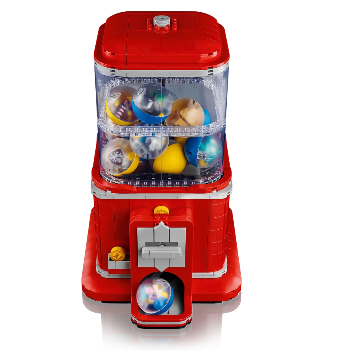 正式商品化的「21358 人偶扭蛋機」擁有 1343 片零件,外觀部分同樣依循著復古的口香糖機、轉蛋機台,在採用紅、灰為主調配色的同時運用了豐富的透明零件當作外殼,讓人可以邊轉邊看到裡頭轉蛋動起來的樣子。當然,經過修改之後的官方版本一樣可以讓你體驗投幣跟轉轉蛋的過程,組完之後不只能擺設更能充分遊玩。