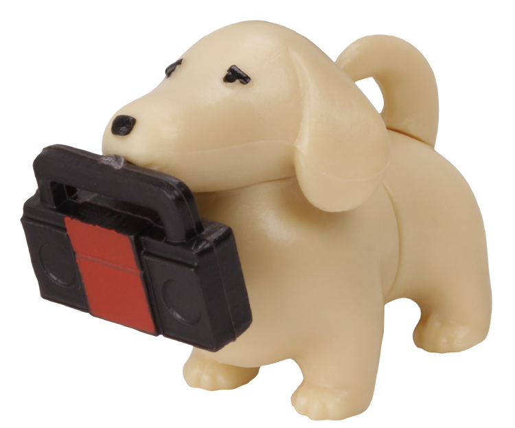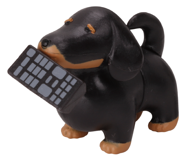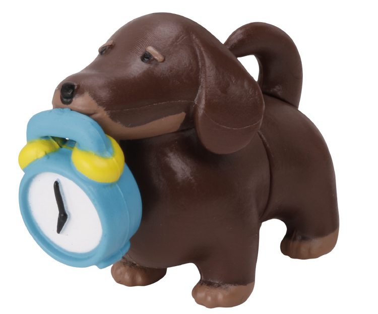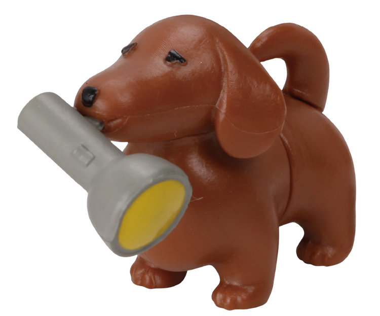 「乾電池臘腸狗」以臘腸狗標誌的短腿長身的體型為發想將狗狗對切,可以分別將頭部跟尾部套在四號電池上讓狗狗的身體變長!一共提供巧克力奶油色、黑/黃褐色、紅棕色以及奶油色共四種款式,每款狗狗的嘴中都會叼有一款需要使用到乾電池的產品,分別是鬧鐘、遙控器、手電筒以及收音機,口中的物品可以取下,尾巴也做有可動,雖然概念簡單但有多種不同的玩法,不管是用乾電池拉長身體還是用預附的零件展示短短的樣子都超級可愛!